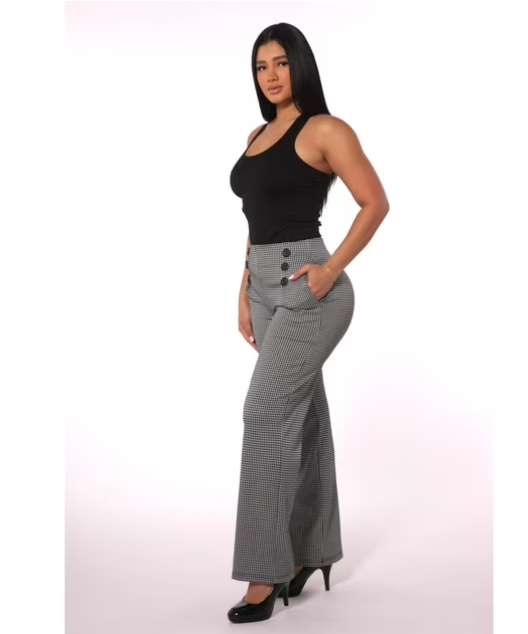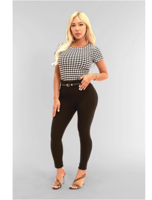 Cropped Straight Leg Pants With Button Waist Detail – Black, White Houndstooth