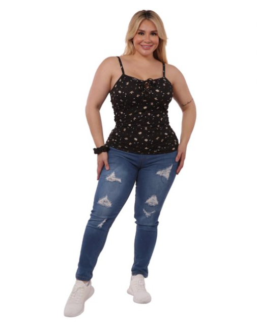 Plus Size Lace-Up Tank Ribbed Tops – Black Floral